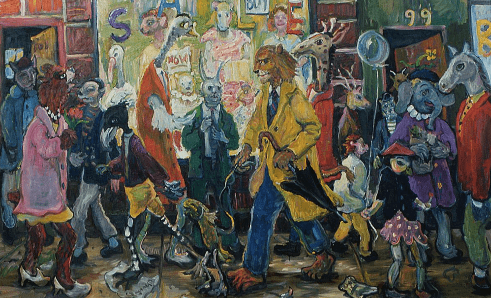 En la obra, figuras comunes del vecindario se convierten en protagonistas de una escena teatral. Un juez aparece representado como un león con gabardina, mientras el propio artista se retrata como un caballo observador, aportando una dimensión introspectiva a la composición.