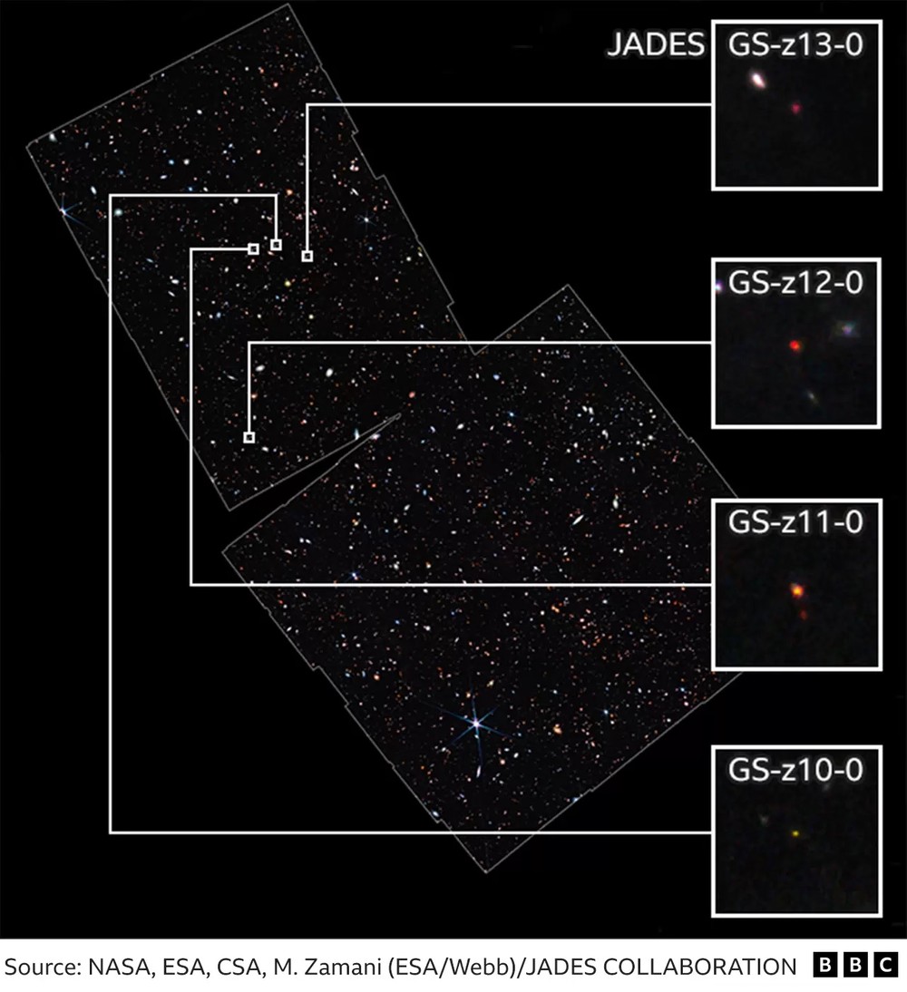 Las galaxias más distantes detectadas por Webb mostraron un desplazamiento al rojo de 13,2, que corresponde a Alrededor de 13.500 millones de años., el más alto jamás medido para cualquier galaxia. Las observaciones se realizaron como parte del proyecto JWST Advanced Deep Extragalactic Survey (JADES), que utiliza NIRCam y NIRSpec para estudiar el universo primitivo de formas que antes eran imposibles.