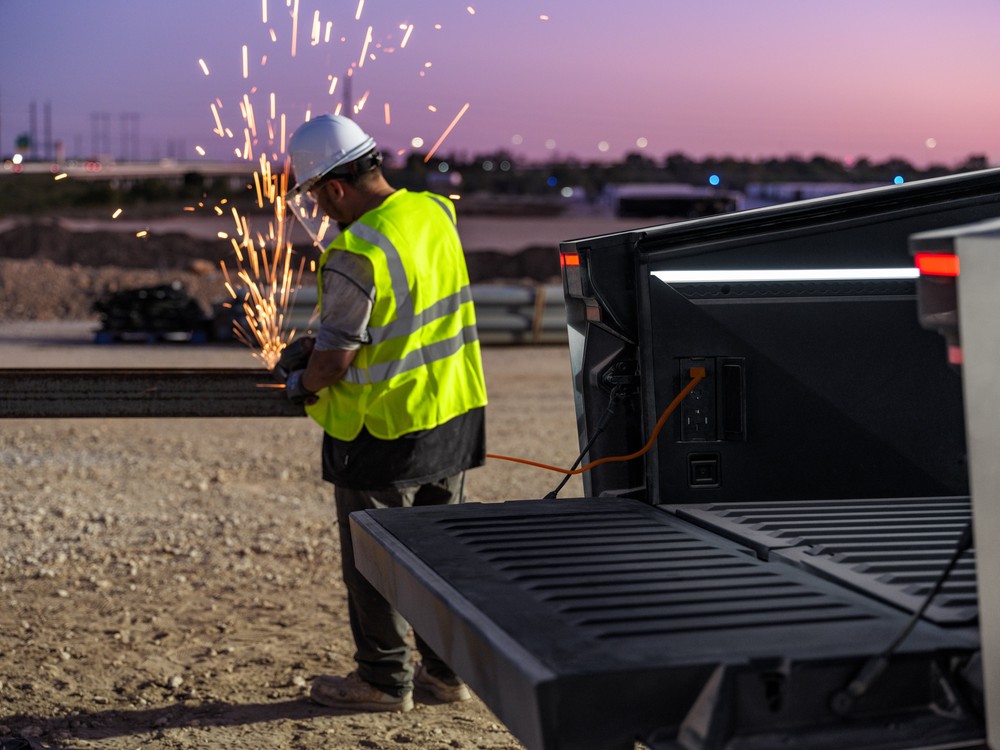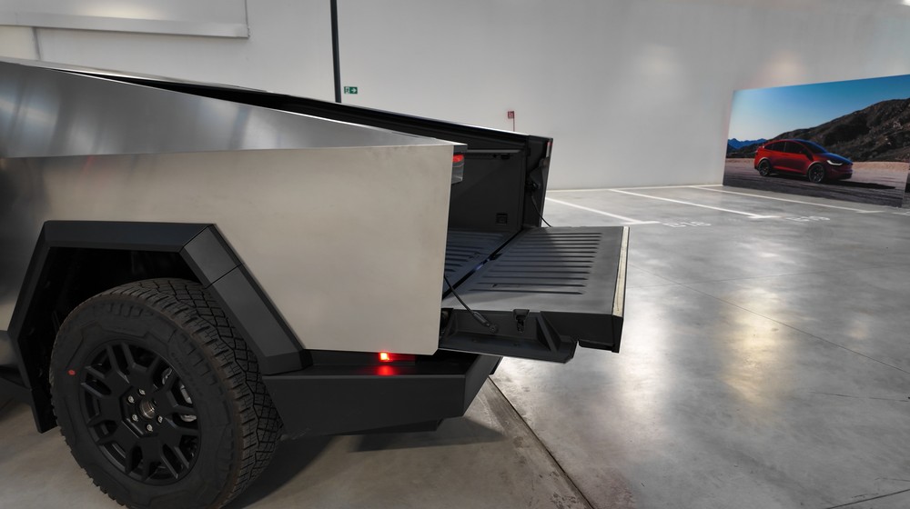 La tecnología Cybertruck también incluye una plataforma de 1.700 litros con cubierta electrificada impermeable que también puede controlarse mediante interruptores externos y soporta hasta 136 kg. En el suelo hay dos enchufes (uno de 120V y otro de 240V) y dos barras de LED que sirven como luces para facilitar las operaciones de carga y descarga durante la noche.